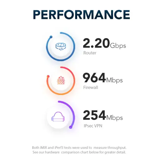 Ytelse referert nedenfor er basert på iPerf3-målinger gjort av Netgate, for mer detaljer om konfigurasjon og målinger, se målinger, se Netgates egen oversikt (PDF).